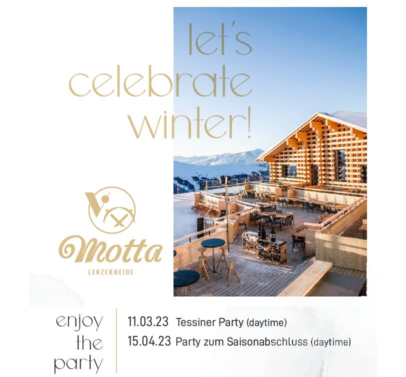 Leggere il menu del Motta Hütte è come leggere una poesia. Accanto alle specialità regionali del Ticino e alle ricette tradizionali del Cantone dei Grigioni interpretate in chiave moderna troverete creazioni culinarie dal tocco internazionale. La maggior parte dei prodotti sono di provenienza locale. La ciliegina sulla torta sono gli eventi esclusivi che si svolgono nell’ambiente rilassante del vostro ristorante a Lenzerheide. Non perdetevi la newsletter del Vista e restate sempre aggiornati sulle ultime novità. Vi basterà cliccare qui per ricevere le news dal vostro ristorante di montanga a Lenzerheide.